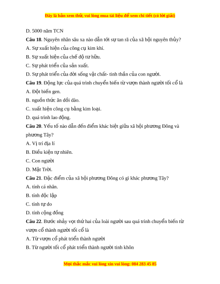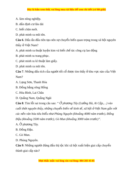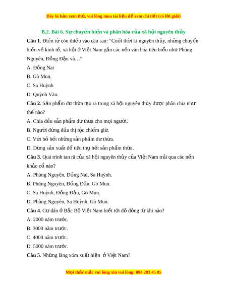 Đây là bản xem th , vu ử i lòng mua tài li u ệ đ xe ể m chi ti t (c ế ó l i ờ gi i ả ) B.2. Bài 6. S chuy ự n bi ể n và p ế hân hóa c a xã h ủ i ộ nguyên th y ủ Câu 1. Đi n t ề ừ còn thi u vào câu s ế au: “Cuối th i ờ kì nguyên th y ủ , nh ng chuy ữ n ể bi n v ế ề kinh t , ế xã h i ộ ở Vi t ệ Nam g n ắ các n n văn hóa ề tiêu bi u nh ể Phùng ư Nguyên, Đồng Đ u ậ và…”. A. Đồng Nai B. Gò Mun. C. Sa Huỳnh D. Quỳnh Văn. Câu 2. S n ả ph m ẩ d t ư h a ừ t o r ạ a trong xã h i ộ nguyên th y đ ủ ư c ợ phân chia nh ư th nào? ế A. Chia đ u s ề n ả ph m ẩ d t ư h a cho m ừ i ọ ngư i ờ . B. Ngư i ờ đ ng đ ứ u t ầ h t ị c chi ộ m ế gi . ữ C. V t ứ bỏ h t ế nh ng s ữ n ả ph m ẩ d t ư h a. ừ D. D ng ừ s n ả xu t ấ đ t ể iêu th h ụ t ế s n ả ph m ẩ th a. ừ