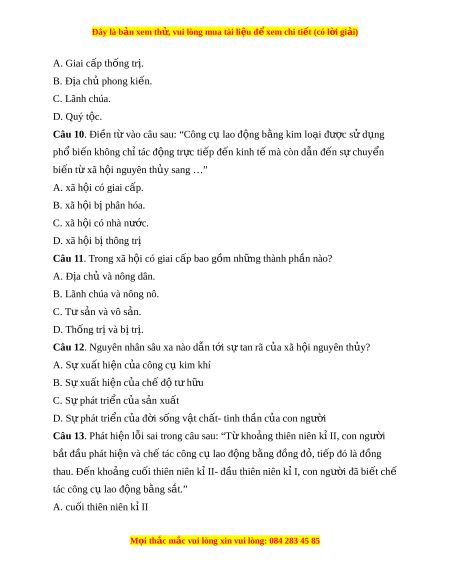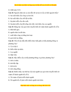 Câu 12. Nguyên nhân sâu xa nào d n t ẫ i ớ s t ự an rã c a ủ xã h i ộ nguyên th y? ủ A. S xu ự ất hi n c ệ a công c ủ ụ kim khí B. S xu ự t ấ hi n c ệ a ủ ch đ ế t ộ h ư u ữ C. S phát ự tri n c ể a ủ s n ả xu t ấ D. S phát ự tri n c ể a đ ủ i ờ sống v t ậ ch t ấ - tinh th n c ầ a ủ con ngư i ờ Câu 13. Phát hi n l ệ i