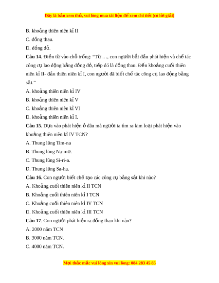 ề ừ vào chỗ trống: “T …, con ừ ngư i ờ b t ắ đ u phát ầ hi n và ch ệ t ế ác công cụ lao đ ng b ộ ng ằ đồng đ , ỏ ti p ế đó là đ ng t ồ hau. Đ n ế kho ng cu ả i ố thiên niên kỉ II- đ u t ầ hiên niên k I ỉ , con ngư i ờ đã bi t ế ch t ế ác công c l ụ ao đ ng b ộ ng ằ s t ắ .” A. kho ng ả thiên niên k I ỉ V B. kho ng t ả hiên niên k ỉ V C. kho ng t ả hiên niên k ỉ VI D. kho ng ả thiên niên k I ỉ . Câu 15. D a ự vào phát hi n ệ đâu m ở à ngư i ờ ta tìm ra kim lo i ạ phát hi n vào ệ kho ng ả thiên niên k I ỉ V TCN? A. Thung lũng Tim-na B. Thung lũng Na-m . ơ C. Thung lũng Si-ri-a. D. Thung lũng Sa-ha. Câu 16. Con ngư i ờ bi t ế ch t ế o ạ các công cụ b ng s ằ t ắ khi nào? A. Kho ng ả cuối thiên niên k I ỉ I TCN B. Kho ng cu ả ối thiên niên k I ỉ TCN C. Kho ng cu ả ối thiên niên k I ỉ V TCN D. Kho ng ả cuối thiên niên k I ỉ II TCN Câu 17. Con ngư i ờ phát hi n r ệ a đ ng t ồ hau khi nào? A. 2000 năm TCN B. 3000 năm TCN. C. 4000 năm TCN. M i ọ thắc m c