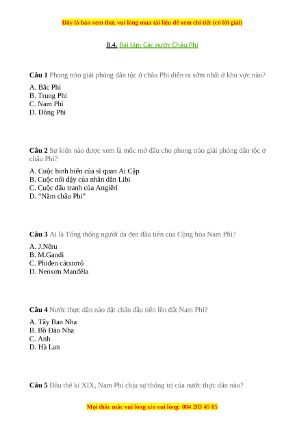 Câu 1 Phong trào giải phóng dân tộc ở châu Phi diễn ra sớm nhất ở khu vực nào? A. Bắc Phi B. Trung Phi C. Nam Phi D. Đông Phi