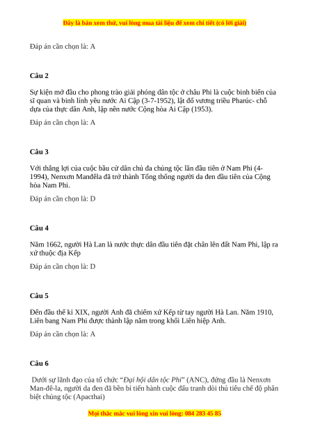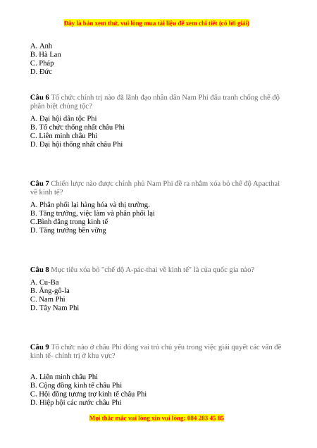 Câu 6 Tổ chức chính trị nào đã lãnh đạo nhân dân Nam Phi đấu tranh chống chế độ phân biệt chủng tộc? A. Đại hội dân tộc Phi