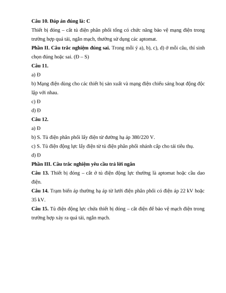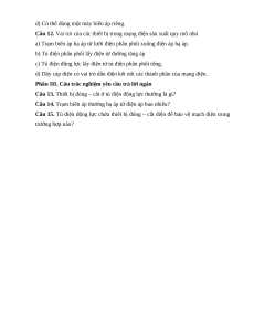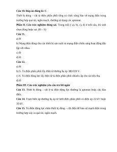 Câu 10. Thiết bị đóng – cắt tủ điện phân phối tổng có chức năng bảo vệ mạng điện trong trường hợp nào? A. Quá tải B. Ngắn mạch C. Quá tải, ngắn mạch