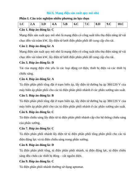 Trắc nghiệm Bài 6: Mạng điện sản xuất quy mô nhỏ Công nghệ 12 Điện-Điện tử Kết nối đúng sai, trả lời ngắn 2025