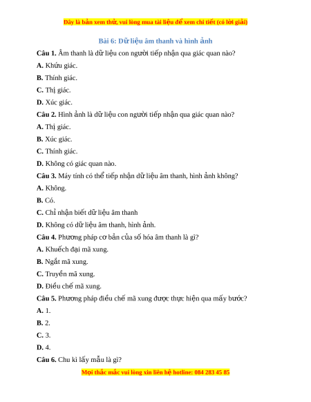 Câu 3. Máy tính có th t ể i p nh ế n ậ d l ữ i u âm ệ thanh, hình nh ả không? A. Không. B. Có. C. Chỉ nh n ậ bi t ế d l ữ i u âm ệ thanh D. Không có d l ữ i u âm ệ thanh, hình nh. ả Câu 4. Phư ng ơ pháp c b ơ n ả c a s ủ hóa âm ố thanh là gì? A. Khu ch ế đ i ạ mã xung. B. Ng t ắ mã xung. C. Truy n m ề ã xung. D. Đi u ch ề ế mã xung. Câu 5. Phư ng ơ pháp đi u ch ề m ế ã xung đư c ợ th c hi ự n qua m ệ y b ấ ư c? ớ A. 1. B. 2. C. 3. D. 4. Câu 6. Chu kì l y m ấ u l ẫ à gì? M i