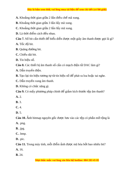 Đây là bản xem th , vu ử i lòng mua tài li u ệ đ xe ể m chi ti t (c ế ó l i ờ gi i ả ) A. Kho ng ả th i ờ gian gi a 2 l ữ n đi ầ u ch ề m ế ã xung. B. Kho ng t ả h i ờ gian gi a ữ 3 l n l ầ y m ấ ã xung. C. Kho ng ả th i ờ gian gi a 2 l ữ n l ầ y m ấ ã xung. D. Là th i ờ đi m ể cách đ u nhau. ề Câu 7. Số bit c n t ầ hi t ế để bi u di ể n đ ễ ư c m ợ t ộ giây âm thanh đư c g ợ i ọ là gì? A. Tốc đ bi ộ t. B. Quãng đư ng bi ờ t. C. Chi u ề dài bit. D. Tín hiệu số. Câu 8. Các thi t ế b âm ị thanh s c ố n có m ầ ch ạ đi n t ệ ử DAC làm gì? A. Dẫn truy n đi ề n. ệ B. T o l ạ i ạ tín hi u t ệ ư ng ơ t t ự t ừ ín hi u s ệ đ ố ể phát ra loa ho c t ặ ai nghe.