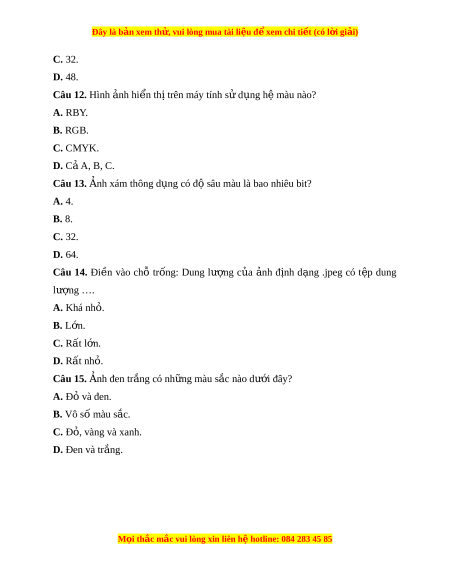 Đây là bản xem th , vu ử i lòng mua tài li u ệ đ xe ể m chi ti t (c ế ó l i ờ gi i ả ) C. 32. D. 48. Câu 12. Hình nh ả hi n t ể h t ị rên máy tính s d ử ng h ụ m ệ àu nào? A. RBY. B. RGB. C. CMYK. D. C ả A, B, C. Câu 13. nh xám Ả thông d ng ụ có đ s