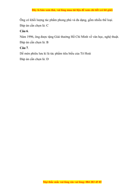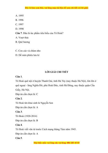 Câu 3. Đâu là năm sinh, năm mất của Tô Hoài? A. 1910 - 2000 B. 1920 - 2014 C. 1930 - 2015 D. 1940 - 2020