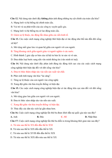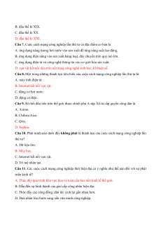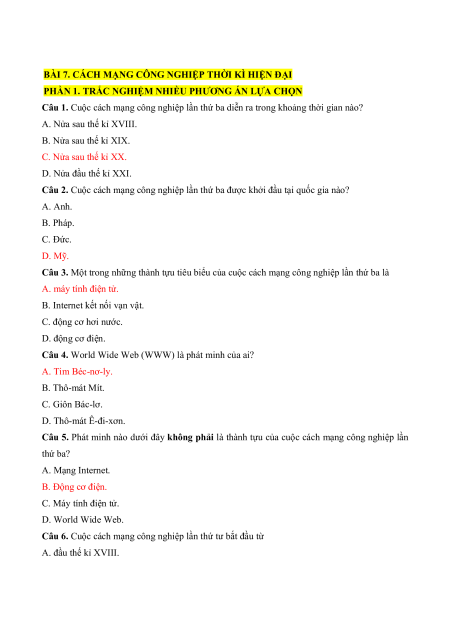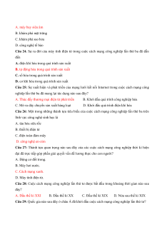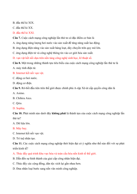 Câu 6. Cuộc cách mạng công nghiệp lần thứ tư bắt đầu từ A. đầu thế kỉ XVIII. B. đầu thế kỉ XIX. C. đầu thế kỉ XX. D. đầu thế kỉ XXI.