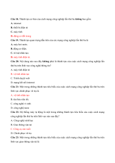 Câu 18. Thành tựu cơ bản của cách mạng công nghiệp lần thứ ba không bao gồm A. internet B. thiết bị điện tử C. máy tính D. động cơ đốt trong
