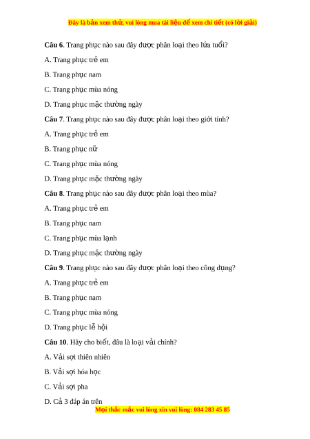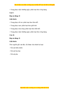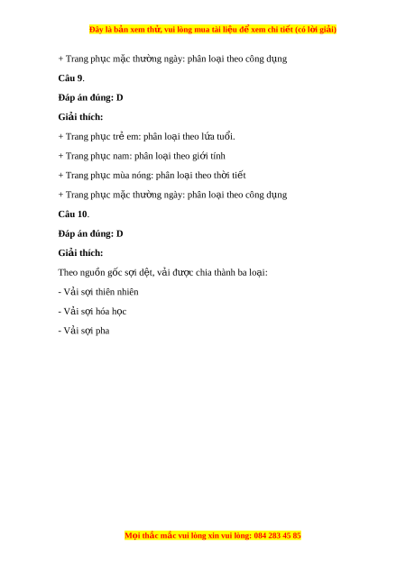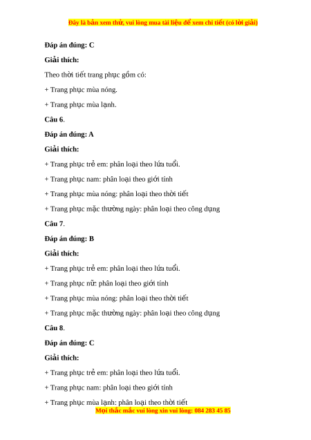 Đây là bản xem th , vu ử i lòng mua tài li u ệ đ xe ể m chi ti t ế (có l i ờ gi i ả ) Đáp án đúng: C Giải thích: Theo th i ờ ti t ế trang ph c g ụ m ồ có: + Trang ph c m ụ ùa nóng. + Trang ph c m ụ ùa l nh. ạ Câu 6. Đáp án đúng: A Giải thích: + Trang ph c t ụ rẻ em: phân lo i ạ theo l a t ứ u i ổ . + Trang ph c nam ụ : phân lo i ạ theo gi i ớ tính + Trang ph c m ụ ùa nóng: phân lo i ạ theo th i ờ ti t ế + Trang ph c m ụ c t ặ hư ng ờ ngày: phân lo i ạ theo công d ng ụ Câu 7. Đáp án đúng: B Giải thích: + Trang ph c t ụ rẻ em: phân lo i ạ theo l a t ứ u i ổ . + Trang ph c n ụ : ữ phân lo i ạ theo gi i ớ tính + Trang ph c m ụ ùa nóng: phân lo i ạ theo th i ờ ti t ế + Trang ph c m ụ c t ặ hư ng ờ ngày: phân lo i ạ theo công d ng ụ Câu 8. Đáp án đúng: C Giải thích: + Trang ph c t ụ rẻ em: phân lo i ạ theo l a t ứ u i ổ . + Trang ph c nam ụ : phân lo i ạ theo gi i ớ tính + Trang ph c m ụ ùa l nh: ạ phân lo i ạ theo th i ờ ti t ế M i