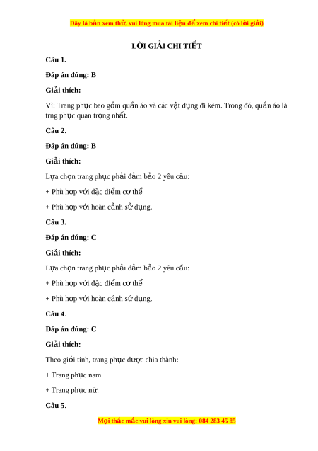 Đây là bản xem th , vu ử i lòng mua tài li u ệ đ xe ể m chi ti t ế (có l i ờ gi i ả ) L I Ờ GIẢI CHI TI T Ế Câu 1. Đáp án đúng: B Giải thích: Vì: Trang ph c bao g ụ ồm qu n áo ầ và các v t ậ d ng đi ụ kèm. Trong đó, qu n áo l ầ à trng ph c ụ quan tr ng ọ nh t ấ . Câu 2. Đáp án đúng: B Giải thích: L a ự ch n t ọ rang ph c ph ụ i ả đ m ả b o 2 yêu ả c u: ầ + Phù h p v ợ i ớ đ c ặ đi m ể c t ơ hể + Phù h p v ợ i ớ hoàn c nh ả s d ử ng. ụ Câu 3. Đáp án đúng: C Giải thích: L a ự ch n t ọ rang ph c ph ụ i ả đ m ả b o 2 yêu ả c u: ầ + Phù h p v ợ i ớ đ c ặ đi m ể c t ơ hể + Phù h p v ợ i ớ hoàn c nh ả s d ử ng. ụ Câu 4. Đáp án đúng: C Giải thích: Theo gi i ớ tính, trang ph c đ ụ ư c ợ chia thành: + Trang ph c nam ụ + Trang ph c n ụ . ữ Câu 5. M i