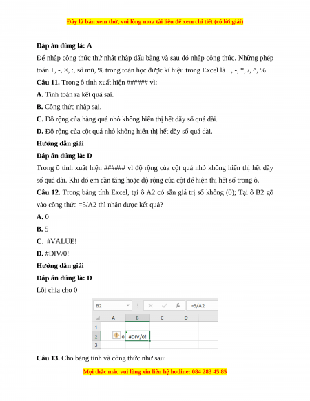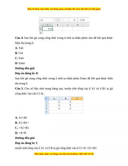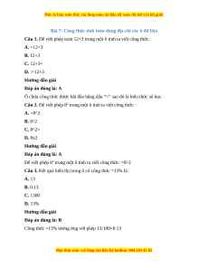 Câu 3. Kết quả hiển thị trong ô có công thức =13% là: A. 13 B. 0.13 C. 1300 D. 13% Hướng dẫn giải