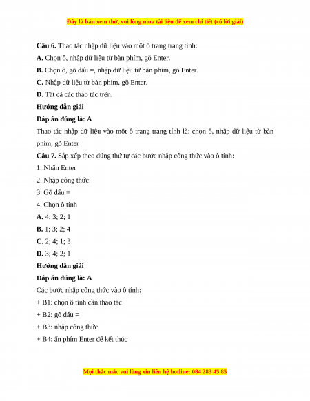 Câu 7. Sắp xếp theo đúng thứ tự các bước nhập công thức vào ô tính: 1. Nhấn Enter 2. Nhập công thức 3. Gõ dấu = 4. Chọn ô tính A. 4; 3; 2; 1 B. 1; 3; 2; 4 C. 2; 4; 1; 3 D. 3; 4; 2; 1 Hướng dẫn giải