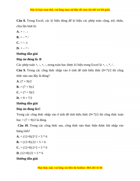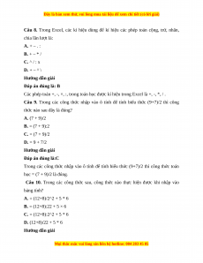Câu 8. Trong Excel, các kí hiệu dùng để kí hiệu các phép toán cộng, trừ, nhân, chia lần lượt là: A. + – . : B. + – * / C. ^ / : x D. + – ^ \ Hướng dẫn giải