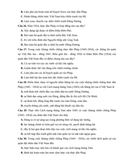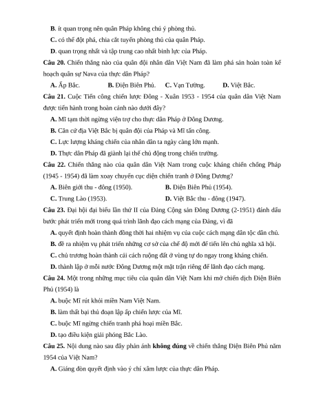 Câu 18. Trong cuộc kháng chiến chống thực dân Pháp (1945-1954), quân đội Việt Nam