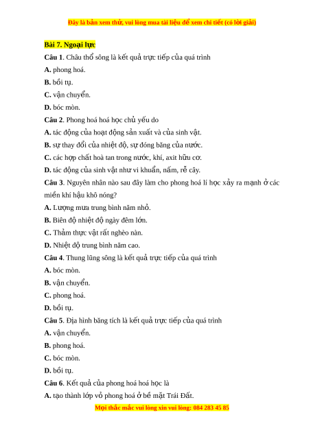Câu 5. Địa hình băng tích là k t ế quả tr c t ự i p c ế a ủ quá trình A. v n chuy ậ n. ể B. phong hoá. C. bóc mòn. D. bồi t . ụ Câu 6. K t ế qu c ả a ủ phong hoá hoá h c ọ là A. t o t ạ hành l p v ớ ỏ phong hoá b ở m ề t ặ Trái Đất. M i