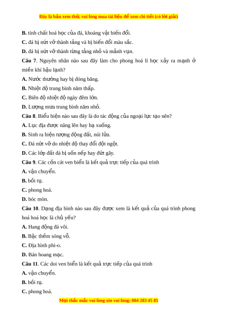 Câu 7. Nguyên nhân nào sau đây làm cho phong hoá lí h c ọ x y ả ra m nh ạ ở mi n khí ề h u ậ l nh? ạ A. Nư c ớ thư ng hay b ờ đóng băng. ị B. Nhi t ệ đ t ộ rung bình năm th p. ấ C. Biên đ nhi ộ t ệ đ ngày đêm ộ l n. ớ D. Lư ng m ợ a t ư rung bình năm nh . ỏ Câu 8. Bi u ể hi n nào s ệ au đây là do tác đ ng c ộ a ủ ngo i ạ l c t ự o ạ nên? A. L c đ ụ ịa đư c