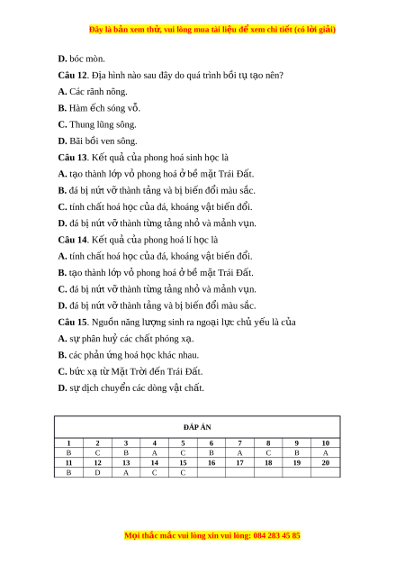 Câu 15. Nguồn năng lư ng s ợ inh ra ngo i ạ l c ch ự y ủ u l ế à c a ủ A. s phân ự hu các ch ỷ ất phóng x . ạ B. các ph n ả ng hoá ứ h c khác nhau. ọ C. b c x ứ ạ t M ừ t ặ Tr i ờ đ n ế Trái Đất. D. s d ự ịch chuy n ể các dòng v t ậ ch t ấ . ĐÁP ÁN 1 2 3 4 5 6 7 8 9 10 B C B A C B A C B A 11 12 13 14 15 16 17 18 19 20 B D A C C M i