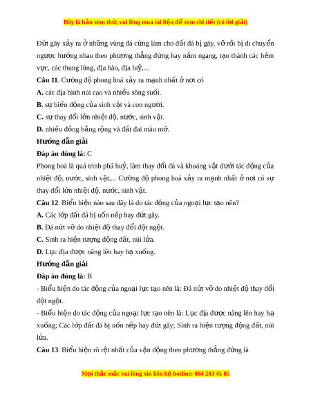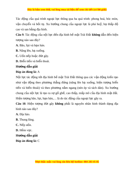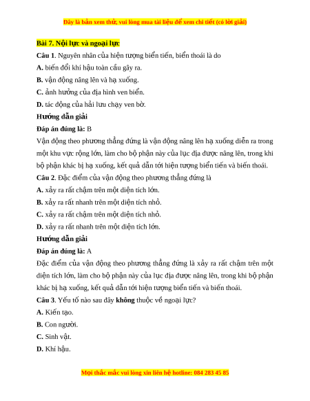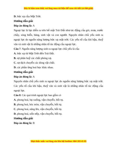 Đây là bản xem th , vu ử i lòng mua tài li u ệ đ xe ể m chi ti t (c ế ó l i ờ gi i ả ) D. b c ứ x c ạ a ủ M t ặ Tr i ờ . Hư ng d ớ ẫn gi i ả Đáp án đúng là: A Ngo i ạ l c ự là l c ự di n ễ ra trên b ề m t ặ Trái Đ t ấ nh ư tác đ ng ộ c a ủ gió, m a, ư nư c ớ ch y ả , sóng bi n, ể băng, sinh v t ậ và con ngư i ờ . Nguyên nhân chủ y u ế sinh ra ngo i ạ l c ự do ngu n ồ năng lư ng ợ b c ứ xạ m t ặ tr i ờ . Các y u ế tố c a ủ khí h u, ậ thuỷ văn và sinh v t ậ là nh ng nhân t ữ t ố ác đ ng c ộ a ngo ủ i ạ l c. ự