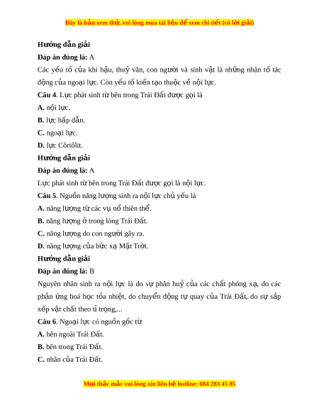 Đây là bản xem th , vu ử i lòng mua tài li u ệ đ xe ể m chi ti t (c ế ó l i ờ gi i ả ) Hư ng d ớ ẫn gi i ả Đáp án đúng là: A Các y u ế tố c a ủ khí h u, ậ thuỷ văn, con ngư i ờ và sinh v t ậ là nh ng ữ nhân tố tác đ ng ộ c a ngo ủ i ạ l c. ự Còn y u t ế ki ố n t ế o t ạ hu c ộ v n ề i ộ l c. ự Câu 4. L c phát ự sinh t bên t ừ rong Trái Đ t ấ đư c g ợ i ọ là A. n i ộ l c. ự B. l c h ự ấp dẫn. C. ngo i ạ l c. ự D. l c ự Côriôlit. Hư ng d ớ ẫn gi i ả Đáp án đúng là: A L c phát ự sinh t bên t ừ rong Trái Đ t ấ đư c g ợ i ọ là n i ộ l c. ự