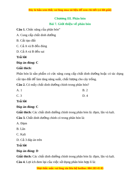 Đây là bản xem th , vu ử i lòng mua tài li u ệ đ xe ể m chi ti t (c ế ó l i ờ gi i ả ) D. C 3 đáp án ả trên Trả l i ờ Đáp án đúng: A Giải thích: + Phân bón hóa h c: ọ Là lo i ạ phân bón đư c s ợ n xu ả t