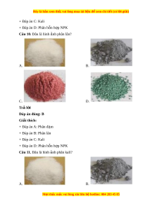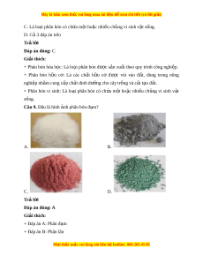 Câu 9. Đâu là hình nh phân bón đ ả m ạ ? A. B. C. D. Trả l i ờ Đáp án đúng: A Giải thích: + Đáp án A: Phân đ m ạ + Đáp án B: Phân lân M i