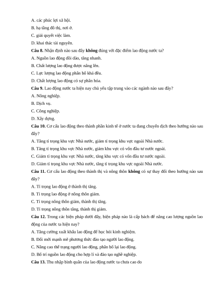Câu 13. Thu nhập bình quân của lao động nước ta chưa cao do