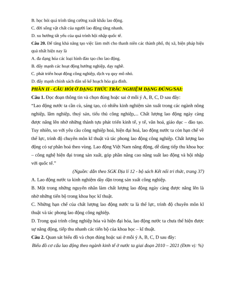 Trắc nghiệm Bài 7: Lao động và việc làm Địa lí 12 Đúng-Sai, Trả lời ngắn sách mới 2025