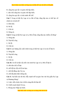 ộ hòa và quân chủ l p hi ậ n. ế D. c ng ộ hòa quý t c và nhà ộ nư c đ ớ ch ế . ế Câu 7. Trong xã h i ộ Hy L p ạ và La Mã cổ đ i ạ , t ng ầ l p ớ nào có thế l c ự về chính trị và kinh t ? ế A. Bình dân. B. Nô l . ệ C. Ch nô. ủ D. Nông nô. Câu 8. Trong xã h i ộ Hy L p và ạ La Mã c đ ổ i ạ , t ng l ầ p nào chi ớ m ế s đông? ố A. Nông dân B. Th t ợ h công ủ C. Nô l . ệ D. Chủ nô. Câu 9. L c l ự ư ng s ợ n xu ả ất chính trong xã h i ộ Hy L p và l ạ a mã c đ ổ i ạ là A. Nông dân B. Th t ợ h công ủ C. Nô l . ệ D. Chủ nô.