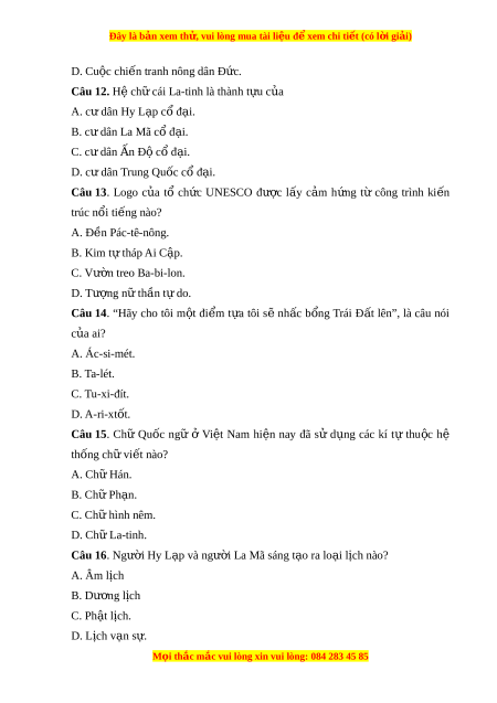 Câu 14. “Hãy cho tôi m t ộ đi m ể t a ự tôi sẽ nh c ấ b ng ổ Trái Đ t ấ lên”, là câu nói c a ai ủ ? A. Ác-si-mét. B. Ta-lét. C. Tu-xi-đít. D. A-ri-xtốt. Câu 15. Chữ Qu c ố ngữ ở Vi t ệ Nam hi n ệ nay đã sử d ng ụ các kí tự thu c ộ hệ thống chữ vi t ế nào? A. Ch H ữ án. B. Chữ Ph n. ạ C. Chữ hình nêm. D. Ch L ữ a-tinh. Câu 16. Ngư i ờ Hy L p và ng ạ ư i ờ La Mã sáng t o r ạ a lo i ạ l ch nào? ị A. Âm lịch B. Dư ng ơ l ch ị C. Ph t ậ l ch. ị D. Lịch v n ạ s . ự M i
