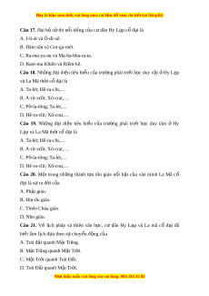 D. Ram-ma Khiên và Riêm-kê. Câu 18. Nh ng ữ đ i ạ di n t ệ iêu bi u c ể a t ủ rư ng phái ờ tri t ế h c duy v ọ t ậ H ở y L p ạ và La Mã th i ờ c đ ổ i ạ là A. Ta-lét; Hê-ra-clit,… B. A-rít-xt t ố ; Xô-crat,… C. P - ờ la-tông; Ta-lét,… D. Hê-ra-clit; Xô-crat,… Câu 19. Nh ng ữ đ i ạ di n ệ tiêu bi u ể c a ủ trư ng ờ phái tri t ế h c ọ duy tâm ở Hy L p và L ạ a Mã th i ờ c đ ổ i ạ là A. Ta-lét; Hê-ra-clit,… B. A-rít-xt t ố ; Xô-crat,… C. P - ờ la-tông; Ta-lét,… D. Hê-ra-clit; Xô-crat,… Câu 20. M t ộ trong nh ng ữ thành t u ự tôn giáo n i ổ b t ậ c a ủ văn minh La Mã cổ đ i ạ là s r ự a đ i ờ c a ủ A. Ph t ậ giáo. B. Hin-đu giáo. C. Thiên Chúa giáo. D. Nho giáo.