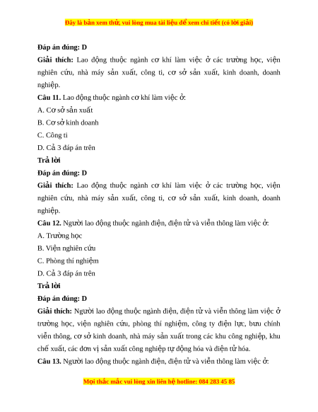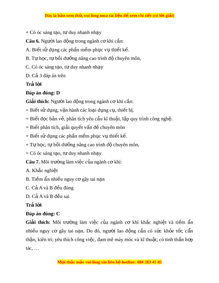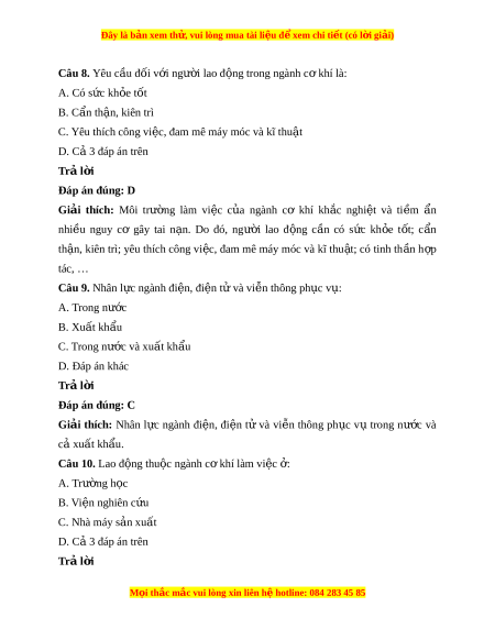 Đây là bản xem th , vu ử i lòng mua tài li u ệ đ xe ể m chi ti t (c ế ó l i ờ gi i ả ) Câu 8. Yêu c u đ ầ ối v i ớ ngư i ờ lao đ ng t ộ rong ngành c khí ơ là: A. Có s c ứ kh e t ỏ ốt B. Cẩn th n, ki ậ ên trì