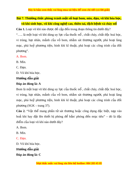 vũ khí sinh h c, vũ khí ọ công ngh cao, ệ thiên tai, d ch b ị nh và cháy n ệ ổ Câu 1. Lo i ạ vũ khí nào đư c ợ đ c ề p ậ đ n t ế rong đo n ạ thông tin dư i ớ đây? “….. là m t ộ lo i ạ vũ khí dùng uy l c ự c a ủ thu c ố n ổ , ch t ấ cháy, ch t ấ đ c ộ hoá h c, ọ vi trùng, h t ạ nhân, m nh ả c a ủ vỏ bom, nh m ằ sát thư ng ơ ngư i ờ , phá ho i ạ làng m c, ạ phá huỷ phư ng ơ ti n, ệ binh khí kĩ thu t ậ , phá ho i ạ các công trình c a ủ đ i ố phư ng”. ơ A. Bom. B. Mìn. C. Đ n. ạ D. Vũ khí hóa h c. ọ Hư ng d ớ ẫn gi i ả Đáp án đúng là: A Bom là m t ộ lo i ạ vũ khí dùng uy l c ự c a ủ thu c ố n ổ , ch t ấ cháy, ch t ấ đ c ộ hoá h c, ọ vi trùng, h t ạ nhân, m nh ả c a ủ vỏ bom, nh m ằ sát thư ng ơ ngư i ờ , phá ho i ạ làng m c, ạ phá huỷ phư ng ơ ti n, ệ binh khí kĩ thu t ậ , phá ho i ạ các công trình c a ủ đ i ố phư ng ơ (SGK – trang 37). Câu 2. “V t ậ thể mang ph n ầ tử sát thư ng ơ ho c ặ công d ng ụ đ c ặ bi t ệ , n p ạ vào hoả khi hay đ t ặ lên thi t ế bị phòng để b n/ ắ phóng đ n ế m c ụ tiêu” – đó là đ c ặ đi m ể c a ủ lo i ạ vũ khí nào dư i ớ đây? A. Bom. B. Mìn. C. Đ n. ạ D. Vũ khí hóa h c. ọ Hư ng d ớ ẫn gi i ả Đáp án đúng là: C M i