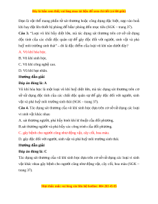 ờ sinh thái (SGK – trang 37). Câu 4. Tác d ng ụ sát thư ng ơ c a ủ vũ khí sinh h c ọ d a ự trên c ơ s ở s ử d ng ụ các lo i ạ vi sinh v t ậ khác nhau A. sát thư ng ng ơ ư i ờ , phá h y bi ủ nh khí kĩ thu t ậ c a ủ đ i ố phư ng. ơ B.sát thư ng ơ ngư i ờ và phá h y các ủ công trình c a đ ủ i ố phư ng. ơ C. gây b nh cho ng ệ ư i ờ cũng như đ ng v ộ t ậ , cây c i ố , hoa màu. D. gây đ c đ ộ ối v i ớ ngư i ờ , sinh v t ậ và phá hu m ỷ ôi trư ng s ờ inh thái. Hư ng d ớ ẫn gi i ả Đáp án đúng là: C Tác d ng ụ sát thư ng ơ c a ủ vũ khí sinh h c ọ d a ự trên c ơ s ở s ử d ng ụ các lo i ạ vi sinh v t ậ khác nhau gây b nh ệ cho ngư i ờ cũng nh ư đ ng ộ v t ậ , cây c i ố , hoa màu (SGK – trang 37). M i
