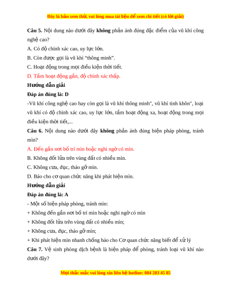 Đây là bản xem th , vu ử i lòng mua tài li u ệ đ xe ể m chi ti t (c ế ó l i ờ gi i ả ) Câu 5. N i ộ dung nào dư i ớ đây không ph n ả ánh đúng đ c ặ đi m ể c a ủ vũ khí công nghệ cao? A. Có đ chí ộ nh xác cao, uy l c l ự n. ớ B. Còn đư c ợ g i