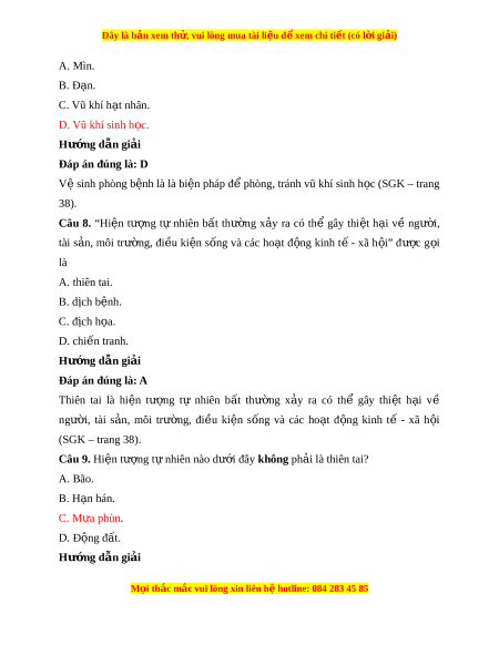 Đây là bản xem th , vu ử i lòng mua tài li u ệ đ xe ể m chi ti t (c ế ó l i ờ gi i ả ) A. Mìn. B. Đ n. ạ C. Vũ khí h t ạ nhân. D. Vũ khí sinh h c. ọ Hư ng d ớ ẫn gi i ả Đáp án đúng là: D Vệ sinh phòng b nh l ệ à là bi n pháp ệ đ phòng, t ể ránh vũ khí sinh h c ( ọ SGK – trang 38).
