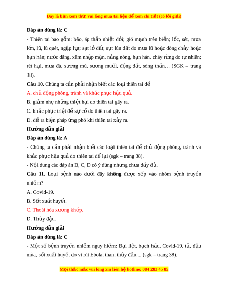 Câu 8. “Hiện tư ng ợ tự nhiên b t ấ thư ng ờ x y ả ra có thể gây thi t ệ h i ạ về ngư i ờ , tài s n, ả môi trư ng, ờ đi u ề ki n ệ s ng ố và các ho t ạ đ ng ộ kinh t ế - xã h i ộ ” đư c ợ g i ọ là A. thiên tai. B. d ch ị b nh. ệ C. đ ch ị h a. ọ D. chi n ế tranh. Hư ng d ớ ẫn gi i ả Đáp án đúng là: A Thiên tai là hi n ệ tư ng ợ tự nhiên b t ấ thư ng ờ x y ả ra có thể gây thi t ệ h i ạ về ngư i ờ , tài s n, ả môi trư ng, ờ đi u ề ki n ệ s ng ố và các ho t ạ đ ng ộ kinh tế - xã h i ộ (SGK – trang 38). Câu 9. Hi n t ệ ư ng t ợ ự nhiên nào dư i ớ đây không ph i ả là thiên tai? A. Bão. B. H n hán. ạ C. M a ư phùn. D. Đ ng ộ đ t ấ . Hư ng d ớ ẫn gi i ả M i