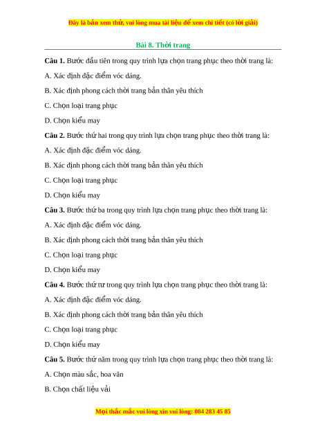 Đây là bản xem th , vu ử i lòng mua tài li u ệ đ xe ể m chi ti t ế (có l i ờ gi i ả ) Bài 8. Th i ờ trang Câu 1. Bư c ớ đ u t ầ iên trong quy trình l a ự ch n t ọ rang ph c t ụ heo th i ờ trang là: A. Xác định đ c ặ đi m ể vóc dáng. B. Xác đ nh phong cách ị th i ờ trang b n t ả hân yêu thích C. Ch n ọ lo i ạ trang ph c ụ D. Ch n ọ ki u ể may Câu 2. Bư c ớ th hai ứ trong quy trình l a ch ự n ọ trang ph c ụ theo th i ờ trang là: A. Xác định đ c ặ đi m ể vóc dáng. B. Xác đ nh phong cách ị th i ờ trang b n t ả hân yêu thích C. Ch n ọ lo i ạ trang ph c ụ D. Ch n ọ ki u ể may Câu 3. Bư c ớ th ba t ứ rong quy trình l a ch ự n ọ trang ph c ụ theo th i ờ trang là: A. Xác định đ c ặ đi m ể vóc dáng. B. Xác đ nh phong cách ị th i ờ trang b n t ả hân yêu thích C. Ch n ọ lo i ạ trang ph c ụ D. Ch n ọ ki u ể may Câu 4. Bư c ớ th t ứ t ư rong quy trình l a ch ự n ọ trang ph c ụ theo th i ờ trang là: A. Xác định đ c ặ đi m ể vóc dáng. B. Xác đ nh phong cách ị th i ờ trang b n t ả hân yêu thích C. Ch n ọ lo i ạ trang ph c ụ D. Ch n ọ ki u ể may Câu 5. Bư c ớ th năm ứ trong quy trình l a ch ự n ọ trang ph c ụ theo th i ờ trang là: A. Ch n ọ màu s c, ắ hoa văn B. Ch n ọ ch t ấ li u v ệ i ả M i