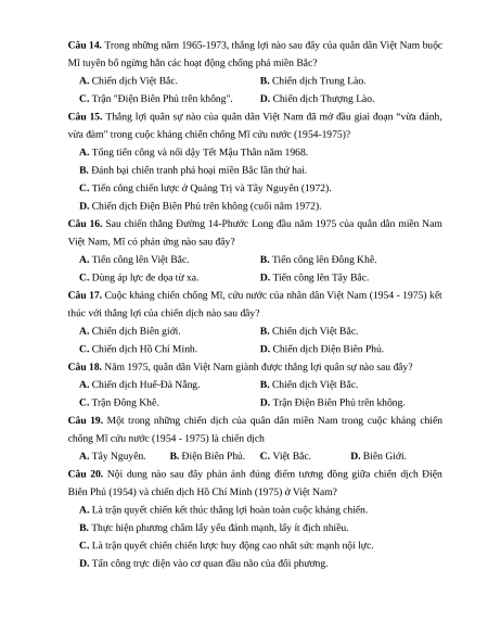 Câu 20. Nội dung nào sau đây phản ánh đúng điểm tương đồng giữa chiến dịch Điện