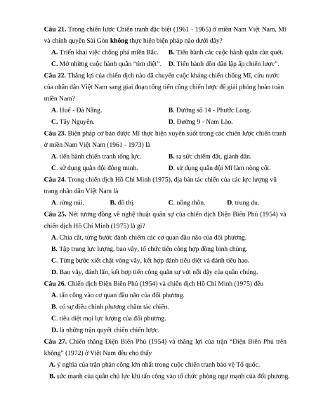 Câu 21. Trong chiến lược Chiến tranh đặc biệt (1961 - 1965) ở miền Nam Việt Nam, Mĩ