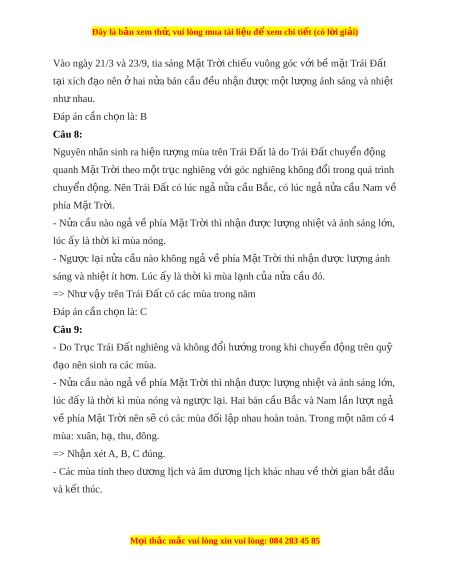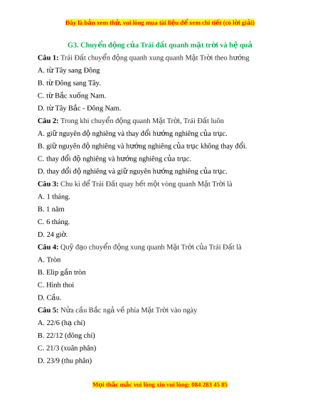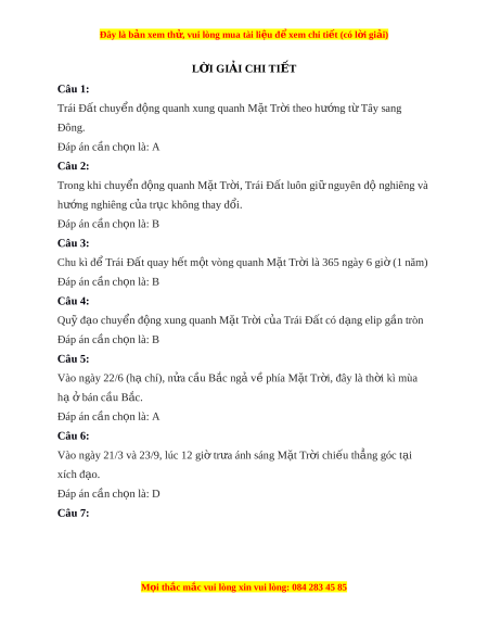Đây là bản xem th , vu ử i lòng mua tài li u ệ đ xe ể m chi ti t (c ế ó l i ờ gi i ả ) L I Ờ GIẢI CHI TI T Ế Câu 1: Trái Đất chuy n ể đ ng quanh xung quanh M ộ t ặ Tr i ờ theo hư ng t ớ ừ Tây sang Đông. Đáp án c n ch ầ n l ọ à: A Câu 2: Trong khi chuy n ể đ ng quanh M ộ t ặ Tr i