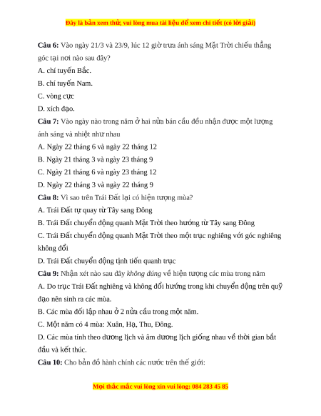 êng và giữ nguyên hư ng nghi ớ êng c a ủ tr c. ụ Câu 3: Chu kì đ ể Trái Đ t ấ quay h t ế m t ộ vòng quanh M t ặ Tr i ờ là A. 1 tháng. B. 1 năm C. 6 tháng. D. 24 gi . ờ Câu 4: Qu đ ỹ o chuy ạ n ể đ ng xung quanh M ộ t ặ Tr i ờ c a ủ Trái Đ t ấ là A. Tròn B. Elip g n t ầ ròn C. Hình thoi D. Cầu. Câu 5: N a c ử ầu B c ng ắ ả v phí ề a M t ặ Tr i ờ vào ngày A. 22/6 (h chí ạ ) B. 22/12 (đông chí) C. 21/3 (xuân phân) D. 23/9 (thu phân) M i ọ thắc m c