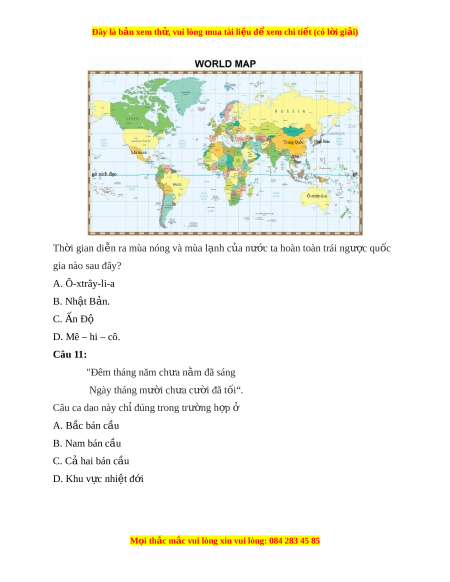 ớ ta hoàn toàn trái ngư c qu ợ c ố gia nào sau đây? A. Ô-xtrây-li-a B. Nh t ậ B n. ả C. n Đ Ấ ộ D. Mê – hi – cô. Câu 11: g cao "Đêm tháng năm ch a n ư m ằ đã sáng Ngày tháng mư i ờ ch a c ư ư i ờ đã t i ố “. Câu ca dao này ch đúng t ỉ rong trư ng ờ h p ợ ở A. B c bán ắ cầu B. Nam bán cầu C. Cả hai bán cầu D. Khu v c ự nhi t ệ đ i ớ M i ọ thắc m c