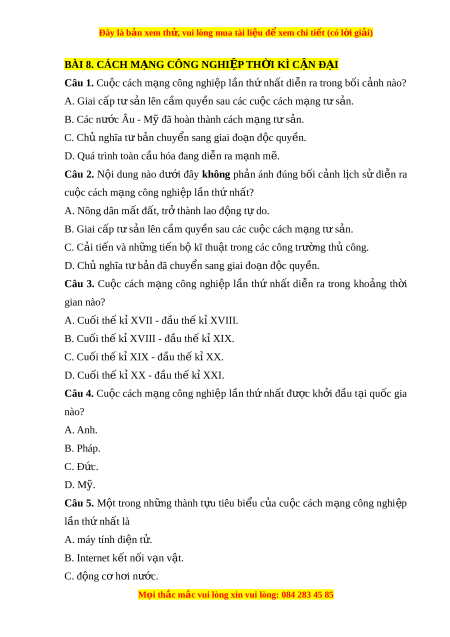 Đây là bản xem th , vu ử i lòng mua tài li u ệ đ xe ể m chi ti t ế (có l i ờ gi i ả ) BÀI 8. CÁCH M N Ạ G CÔNG NGHI P Ệ TH I Ờ KÌ C N Ậ Đ I Ạ Câu 1. Cu c ộ cách m ng ạ công nghi p l ệ n t ầ h nh ứ t ấ di n r ễ a trong b i ố c nh nào? ả A. Giai c p t ấ s ư n ả lên c m ầ quy n s ề au các cu c ộ cách m ng ạ t s ư n. ả B. Các nư c