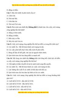 D. Quá trình toàn c u hóa đang di ầ n r ễ a m nh m ạ . ẽ Câu 2. N i ộ dung nào dư i ớ đây không ph n ả ánh đúng b i ố c nh ả l ch ị s ử di n ễ ra cu c cách ộ m ng công nghi ạ ệp lần th nh ứ ất? A. Nông dân mất đ t ấ , tr t ở hành lao đ ng ộ t do. ự B. Giai c p t ấ s ư n l ả ên c m ầ quy n s ề au các cu c cách ộ m ng t ạ s ư n. ả C. C i ả ti n và nh ế ng t ữ i n b ế ộ kĩ thu t ậ trong các công trư ng t ờ h công. ủ D. Ch nghĩ ủ a t b ư n đã chuy ả n ể sang giai đo n ạ đ c quy ộ n. ề Câu 3. Cu c ộ cách m ng ạ công nghi p ệ l n ầ thứ nh t ấ di n ễ ra trong kho ng ả th i ờ gian nào? A. Cuối th k ế X ỉ VII - đ u t ầ h k ế X ỉ VIII. B. Cuối th k ế X ỉ VIII - đ u t ầ h k ế X ỉ IX. C. Cuối th k ế X ỉ IX - đ u t ầ h k ế X ỉ X. D. Cuối th k ế X ỉ X - đ u t ầ h k ế X ỉ XI. Câu 4. Cu c ộ cách m ng ạ công nghi p ệ l n t ầ h ứ nh t ấ đư c ợ kh i ở đ u ầ t i ạ qu c ố gia nào? A. Anh. B. Pháp. C. Đ c. ứ D. M . ỹ Câu 5. M t ộ trong nh ng ữ thành t u ự tiêu bi u ể c a ủ cu c ộ cách m ng ạ công nghi p ệ lần thứ nhất là A. máy tính đi n t ệ . ử B. Internet k t ế n i ố v n ạ v t ậ . C. đ ng c ộ ơ h i ơ nư c. ớ M i