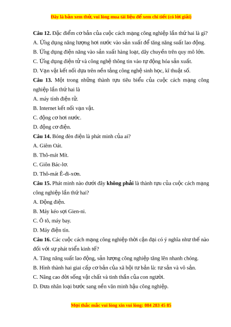 Đây là bản xem th , vu ử i lòng mua tài li u ệ đ xe ể m chi ti t ế (có l i ờ gi i ả ) Câu 12. Đ c ặ đi m ể c b ơ n c ả a ủ cu c ộ cách m ng công ạ nghi p l ệ n t ầ h hai ứ là gì? A. ng d Ứ ng năng l ụ ư ng ợ h i ơ nư c vào s ớ n xu ả t ấ đ t ể ăng năng su t ấ lao đ ng. ộ B. ng d Ứ ng đi ụ ện năng vào s n xu ả ất hàng lo t ạ , dây chuy n t ề rên quy mô l n. ớ C. ng d Ứ ng đi ụ ện t và công ử ngh t ệ hông tin vào t đ ự ng ộ hóa s n ả xu t ấ . D. V n ạ v t ậ k t ế n i ố d a t ự rên n n t ề ng ả công ngh s ệ inh h c, kĩ ọ thu t ậ s . ố Câu 13. M t ộ trong nh ng ữ thành t u ự tiêu bi u ể c a ủ cu c ộ cách m ng ạ công nghiệp lần th hai ứ là A. máy tính đi n t ệ . ử B. Internet k t ế n i ố v n ạ v t ậ . C. đ ng c ộ ơ h i ơ nư c. ớ D. đ ng c ộ ơ đi n. ệ