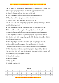Đây là bản xem th , vu ử i lòng mua tài li u ệ đ xe ể m chi ti t (c ế ó l i ờ gi i ả ) Câu 17. N i ộ dung nào dư i ớ đây không ph n ả ánh đúng ý nghĩa c a ủ các cu c ộ cách m ng công nghi ạ p t ệ h i ờ c n ậ đ i ạ đ i ố v i ớ sự phát tri n ki ể nh t ? ế A. Chuy n ể n n s ề n xu ả t ấ th công s ủ ang c khí ơ hoá. B. Thúc đ y s ẩ phát ự tri n c ể a nông nghi ủ p, gi ệ ao thông v n ậ t i ả . C. Tăng năng su t ấ lao đ ng, ộ t o r ạ a nhi u s ề n ả ph m ẩ h n. ơ D. Đ a ư con ngư i ờ bư c ớ sang n n văn m ề inh thông tin. Câu 18. Các cu c ộ cách m ng ạ công nghi p ệ th i ờ c n ậ đ i ạ có tác đ ng ộ như thế nào đ n ế đ i ờ sống xã h i ộ ? A. Thúc đ y s ẩ ự giao l u, k ư t ế n i ố văn hóa gi a các ữ qu c gi ố a, châu l c. ụ B. Làm xu t ấ hi n nhi ệ u t ề rung tâm công nghi p, t ệ hành th đông dân. ị C. Chuy n n ể n s ề n xu ả t ấ c a ủ nhân lo i ạ t c ừ khí ơ hoá sang đi n khí ệ hoá. D. Thúc đ y s ẩ ự phát tri n ể c a ngành nông nghi ủ p và gi ệ ao thông v n ậ t i ả . Câu 19. Các cu c ộ cách m ng ạ công nghi p ệ th i ờ c n ậ đ i ạ có tác đ ng ộ như thế nào đ n ế đ i ờ sống văn hóa? A. Thúc đ y s ẩ ự giao l u, k ư t ế n i ố văn hóa gi a các ữ qu c gi ố a, châu l c. ụ B. Làm xu t ấ hi n nhi ệ u t ề rung tâm công nghi p, t ệ hành th đông dân. ị C. Chuy n n ể n s ề n xu ả t ấ c a ủ nhân lo i ạ t c ừ khí ơ hoá sang đi n khí ệ hoá. D. Thúc đ y s ẩ ự phát tri n ể c a ngành nông nghi ủ p và gi ệ ao thông v n ậ t i ả .