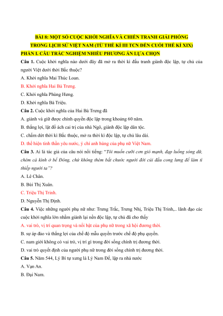 Câu 7. Cuộc khởi nghĩa Hai Bà Trưng (40 - 43) và khởi nghĩa Lý Bí (542 - 603) đều