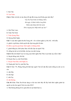 Câu 9. Năm 776, Phùng Hưng đã lãnh đạo người Việt nổi dật đấu tranh chống lại ách cai trị của A. nhà Hán. B. nhà Ngô. C. nhà Tùy. D. nhà Đường.