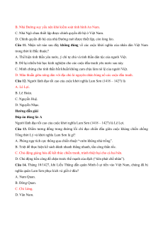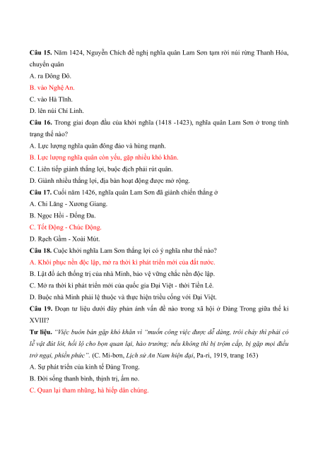 Câu 15. Năm 1424, Nguyễn Chích đề nghị nghĩa quân Lam Sơn tạm rời núi rừng Thanh Hóa, chuyển quân A. ra Đông Đô. B. vào Nghệ An. C. vào Hà Tĩnh. D. lên núi Chí Linh.
